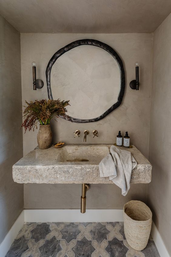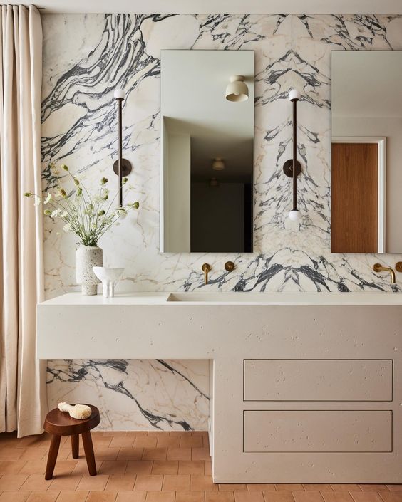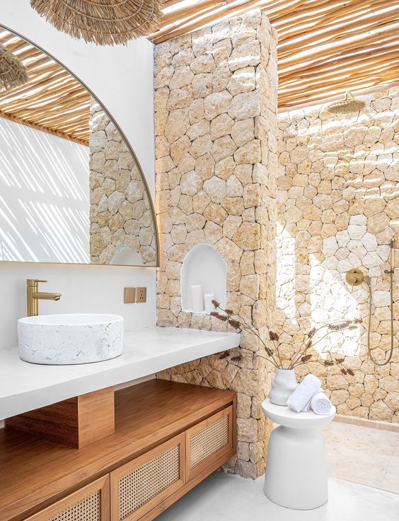 La piedra natural con textura y en color clarito es tendencia en el baño. Ya sea en la pared, ducha o bañera, o en otras zonas como la pared del espejo y la bacha, las piedras naturales con distintos acabados y colores entran con fuerza. El mármol y el granito para las paredes del baño aportan elegancia, glamour y personalidad. Para conseguir un estilo clásico, el mármol en tonos blancas o negros es una apuesta segura. Para una solución más vívida, existen colores como el rosa o el azul. Una estética minimalista más sencilla, los colores neutros como el gris o en tonos crudos dan una sensación de calma y bienestar.